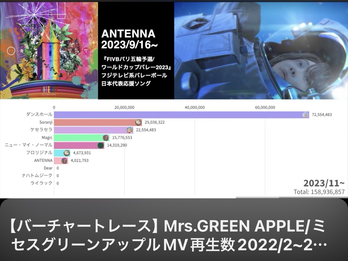 Mrs.GREEN APPLEの2022年(フェーズ2)以降のYouTubeの動画再生数のバーチャートレースを制作しました!