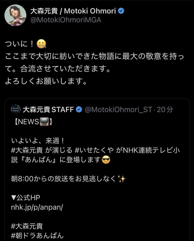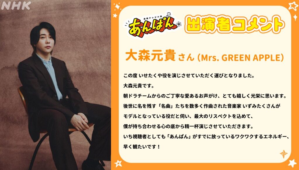 3月31日(月)からスタートするNHK連続テレビ小説『あんぱん』に、大森元貴が出演することが決定いたしました!